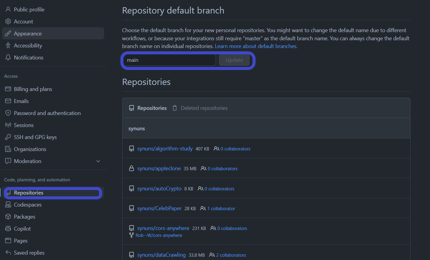 Repositories에서 master를 main으로 바꿔서 입력해서 Update한다.