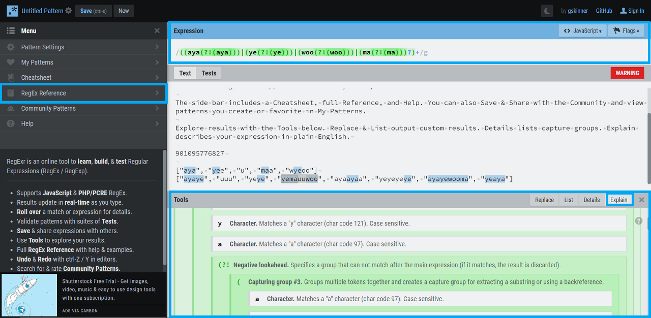 하단 Tools에서 내가 작성한 정규표현식에 대한 Explain도 확인할 수 있으며