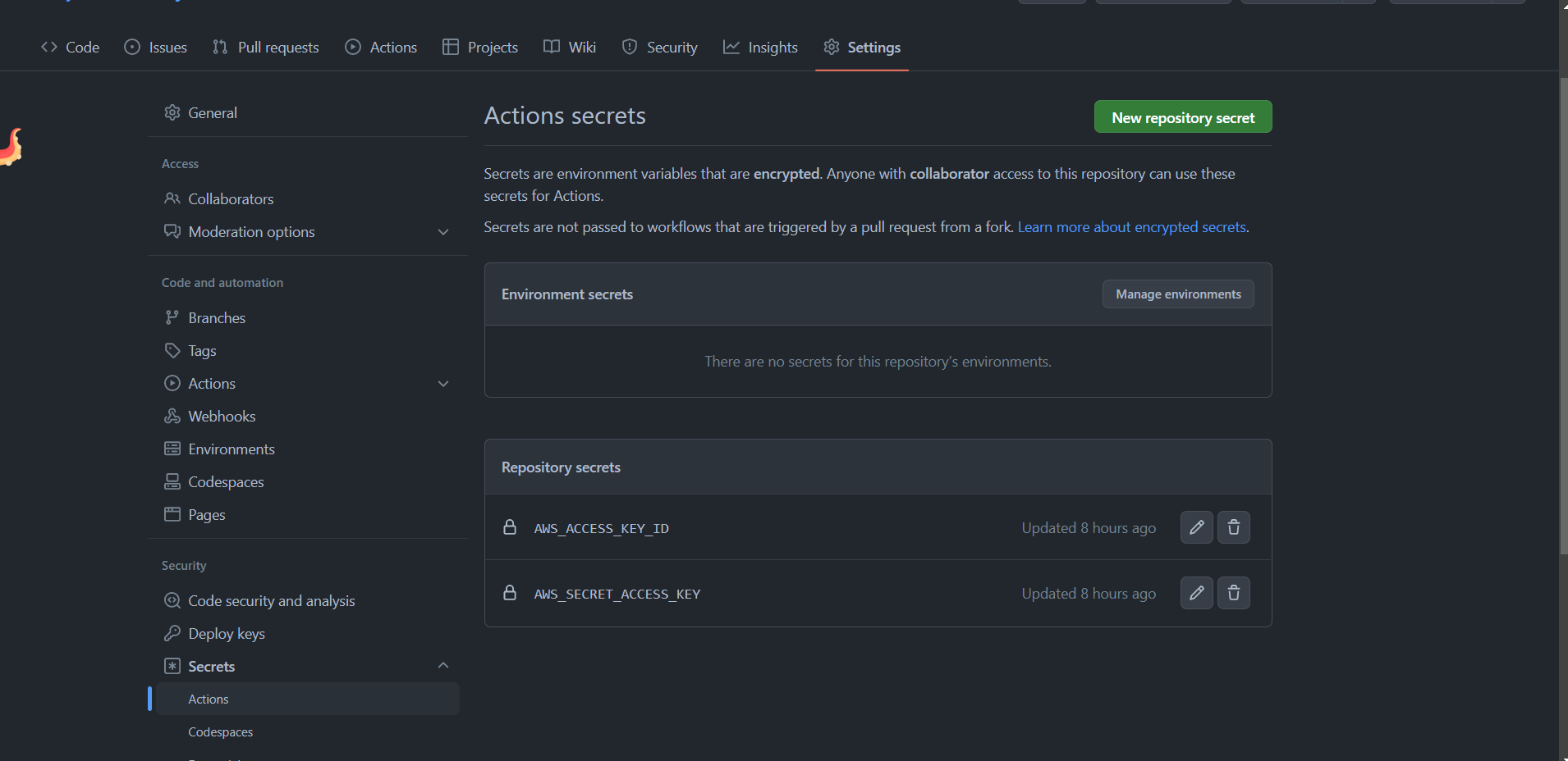 배포가 정상적으로 돌아가려면 AWS 키 뿐만 아니라 .env로 관리하고 있는 환경변수도 추가가 되어야 할 것이다. 하지만 github상에는 .env를 업로드하지 않았을 것이다. 그럴때도 secrets를 이용하면 된다.